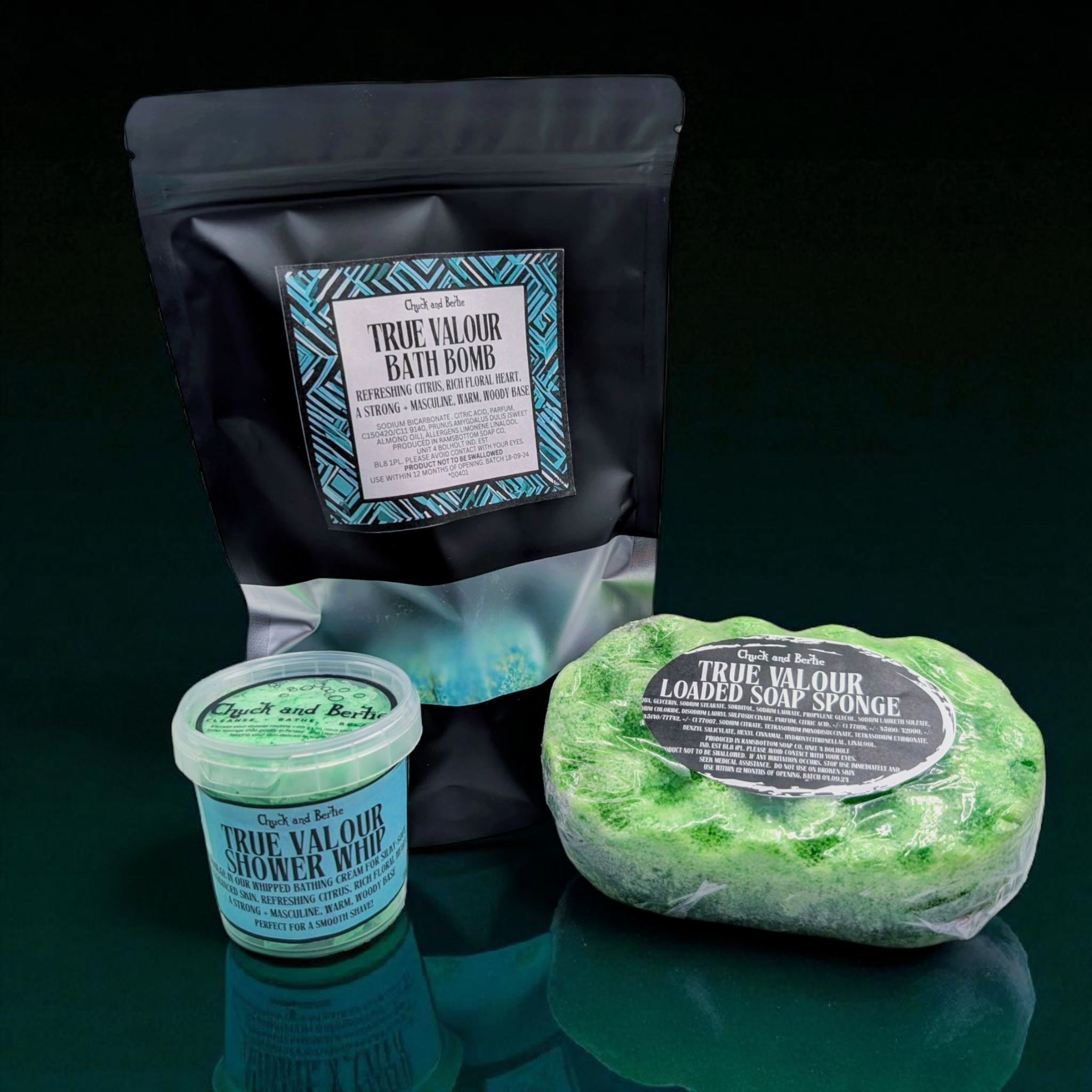 Elevate your grooming routine with our TRUE VALOUR Soak and Suds Box—a bold and luxurious collection inspired by an iconic designer fragrance.